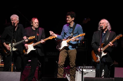 2nd Light Up The Blues Concert - An Evening Of Music To Benefit Autism Speaks - Inside LOS ANGELES, CA - APRIL 05: (L-R) Musicians Graham Nash, Stephen Stills, John Mayer, and David Crosby perform onstage at the 2nd Light Up The Blues Concert - An Evening Of Music To Benefit Autism Speaks at The Theatre At Ace Hotel on April 5, 2014 in Los Angeles, California. (Photo by Imeh Akpanudosen/Getty Images for LUTB) (Imeh Akpanudosen)