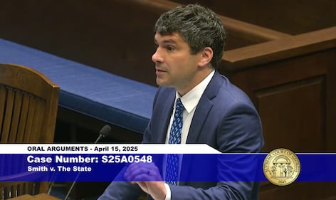 Gwinnett County Assistant District Attorney Christopher M. Deneve argues the case of Danyel Smith at the Supreme Court of Georgia on April 15, 2[1] (WSB Radio)