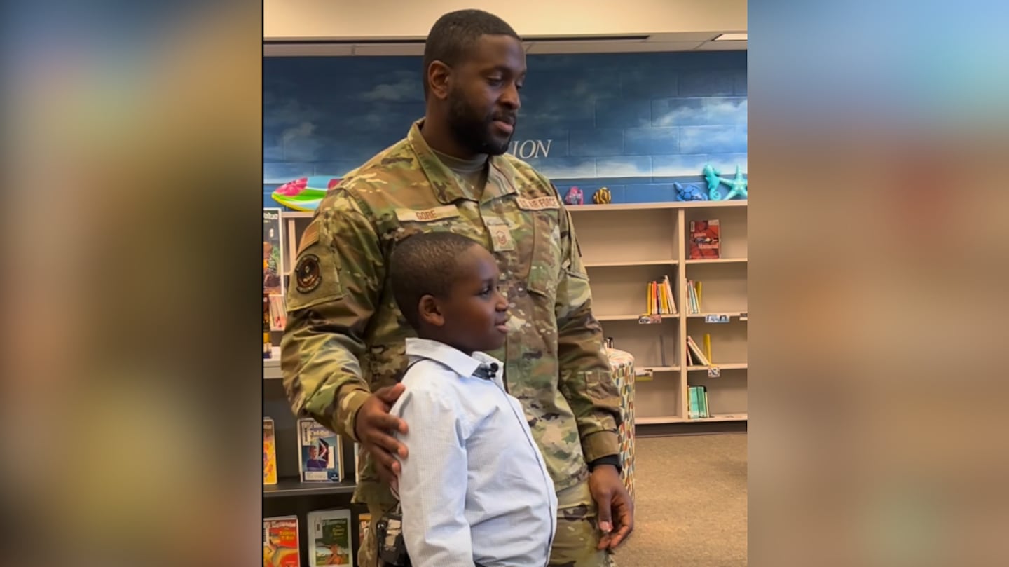 The Kemp Elementary school principal showed Amare Gore a video message from his father, U.S. Air Force Master Sgt. Osei Gore, during the school’s holiday program. But the real surprise was waiting around the corner for him.