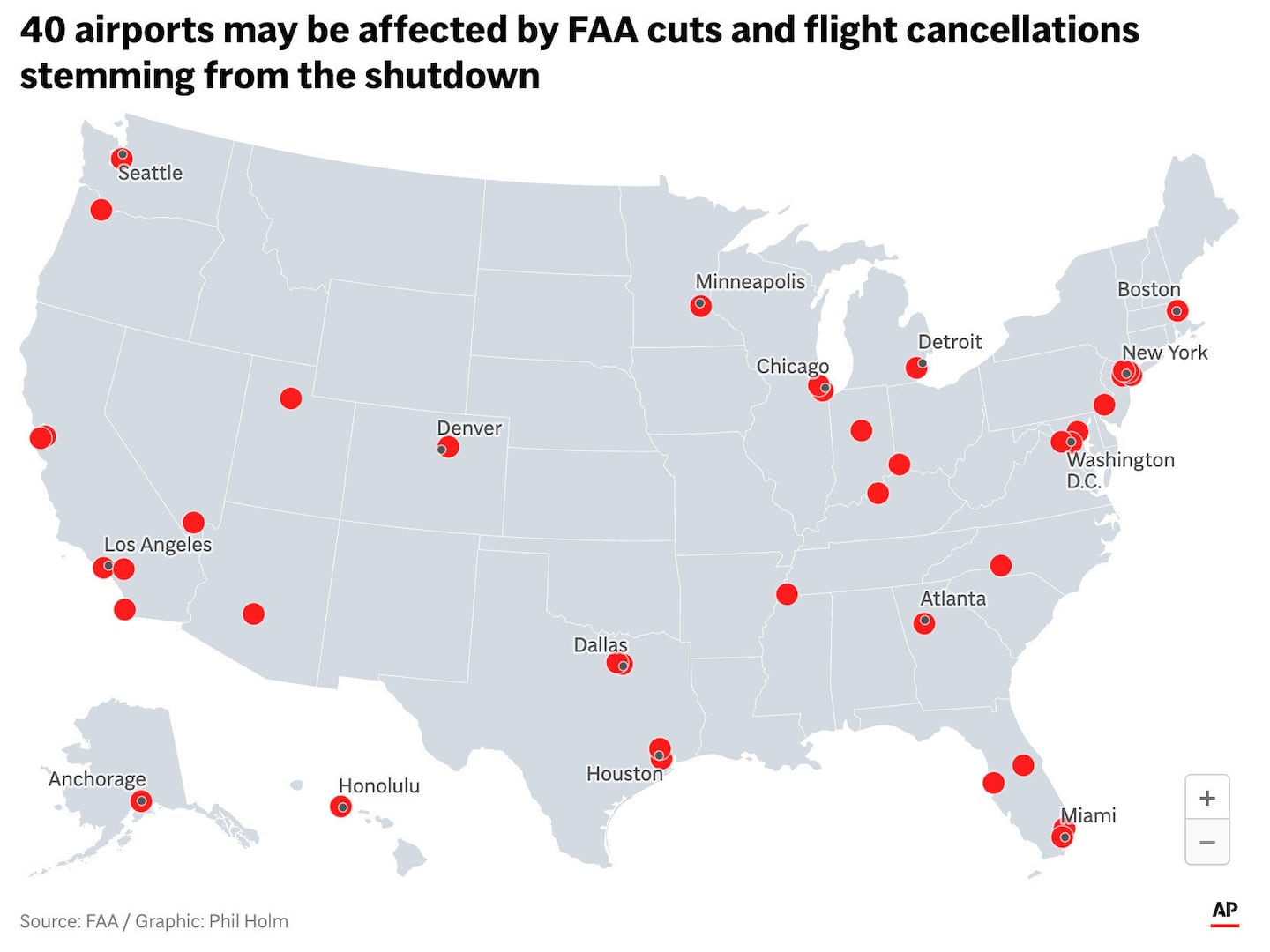 Update 10:28 a.m. ET Nov. 6: Airports in the New York metropolitan area, Los Angeles and Chicago are among the 40 airports that will have flights cut beginning on Friday, The Associated Press reported.