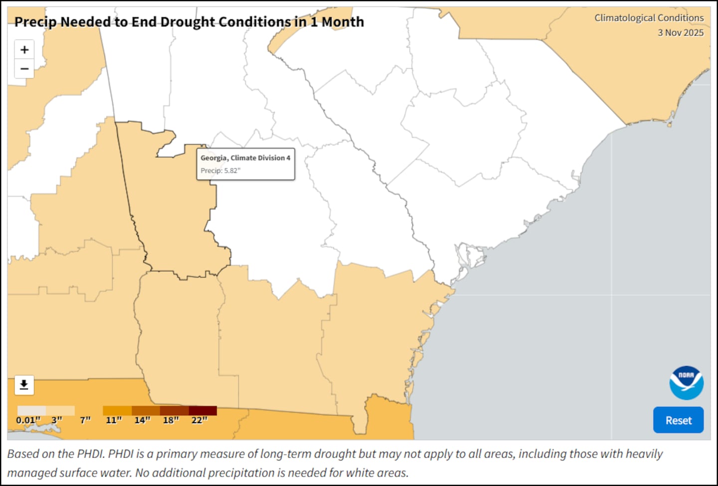 According to NOAA and Drought.gov, the area experiencing the Severe Drought conditions will need an additional 5 to 6 inches of rain in the next 4 weeks in order to end the drought.