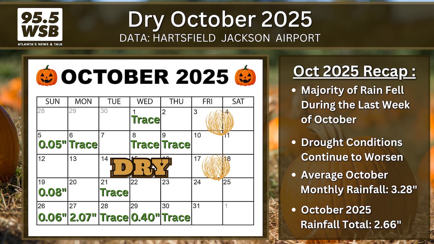 Overall, the October rain totals for Metro Atlanta still measured up below average with only 2.66 inches of rain through the end of the month.